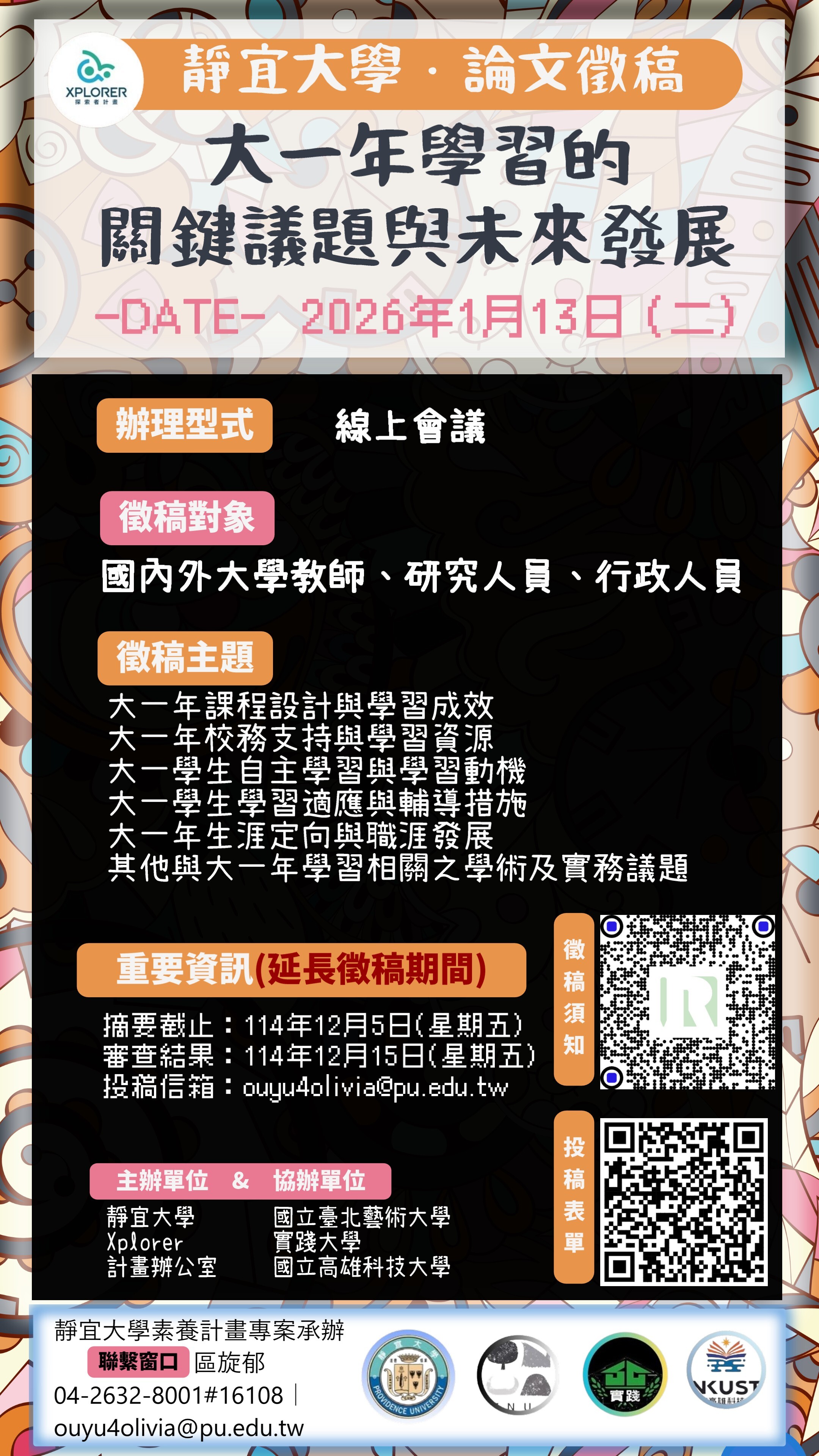 延長徵稿期間說明:靜宜大學「大一年學習的關鍵議題與未來發展」學術研討會現正進行論文摘要徵稿活動,考量有意願人員的準備情況,延長徵稿收件時間至113年12月5日(五)截止,有意願投稿的國內外大學校院專兼任教師,以及與本研討會主題相關之研究人員與行政人員,請踴躍投稿,如各位具意願正在準備中,或有任何問題,歡迎來信告知(歐小姐ouyu4olivia@pu.edu.tw)。